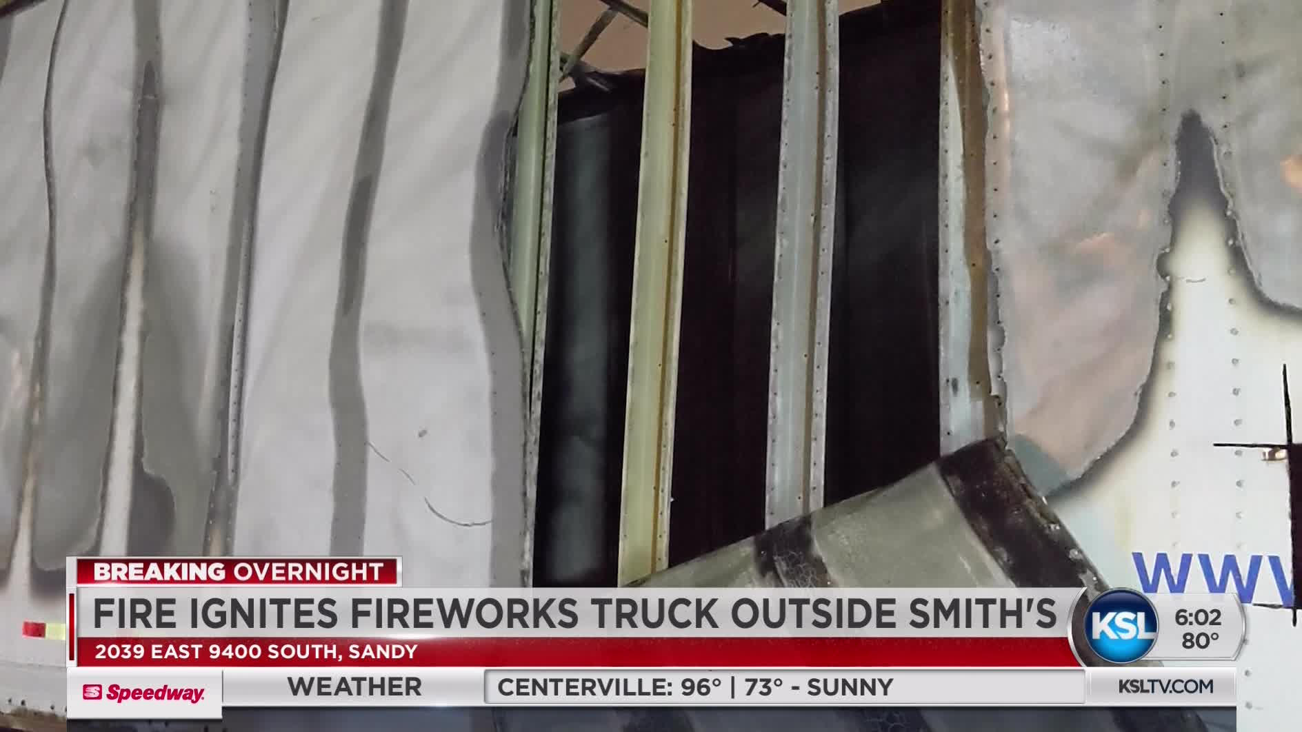 SANDY — Fire damaged a trailer containing fireworks and sent flames at least 100 feet into the air outside a Smith's Food and Drug store in Sandy early Thursday morning, officials said.