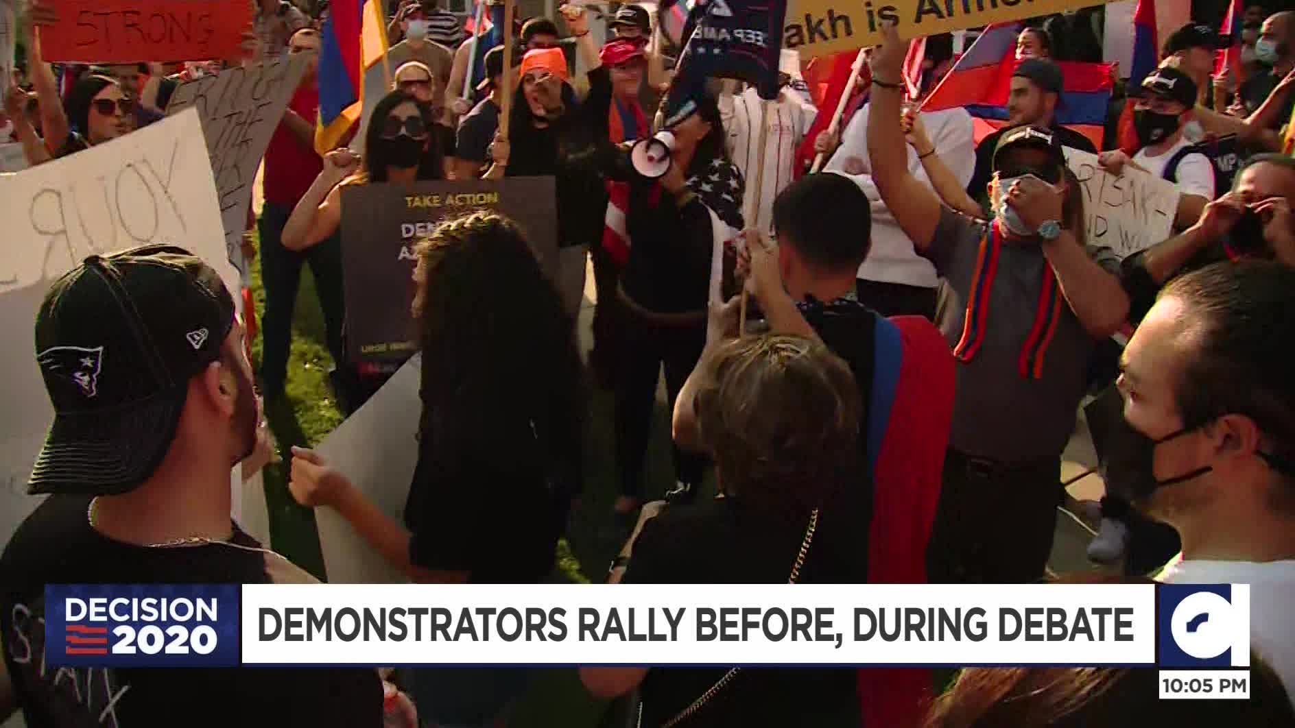 Demonstrators of all kinds, including a group of Armenians waving red, blue and orange flags, started gathering outside the perimeter of the vice presidential debate venue at the University of Utah in the hours before the debate began.