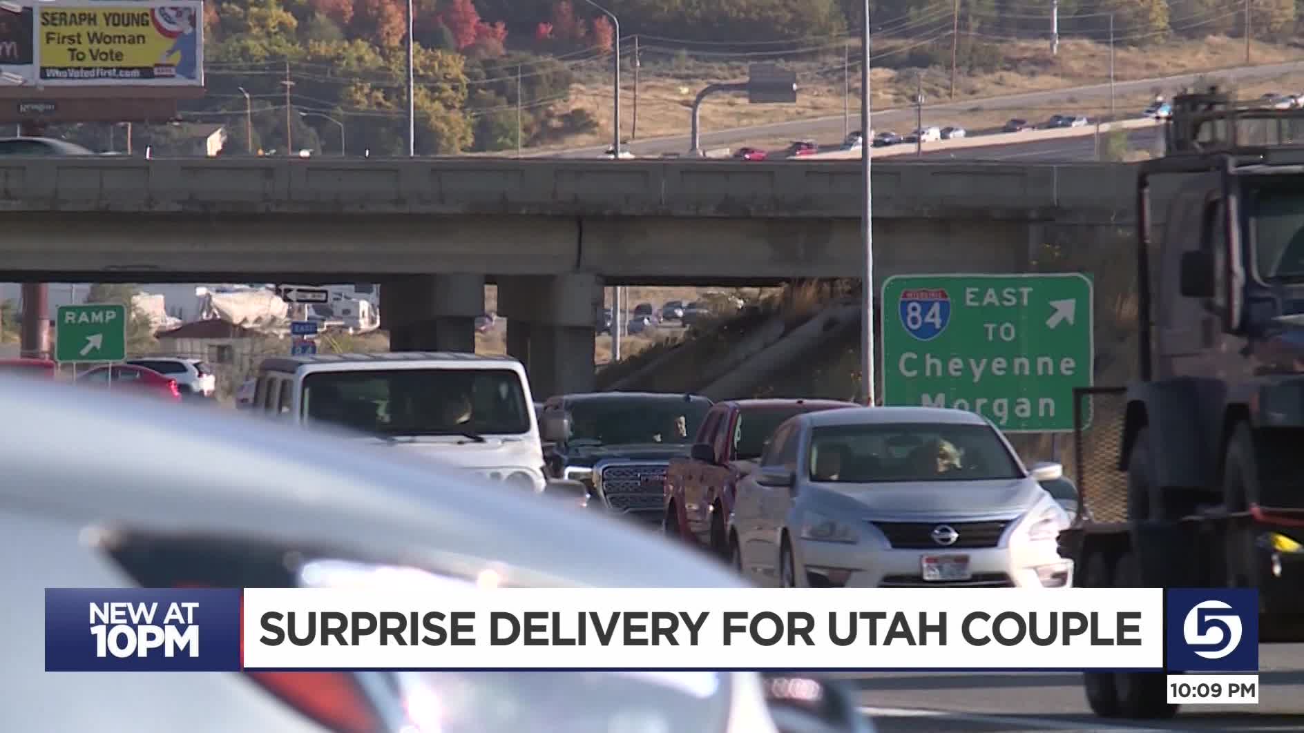 Her husband couldn’t drive fast enough, and the couple pulled off U.S. 89 near South Weber Drive.