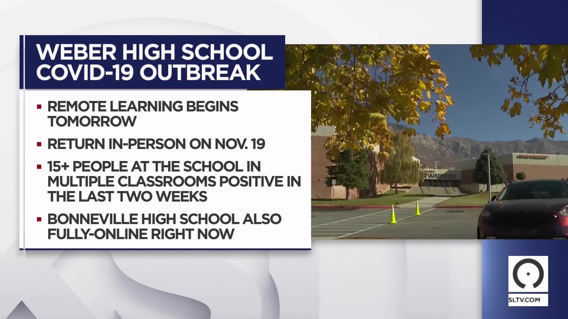 Syracuse High School will shift to remote schooling for at least two weeks, the school announced Wednesday in a letter to parents and the community signed by principal Jed Johansen. Later in the day, Weber also announced a move to online learning, beginning Thursday, through Nov. 18.