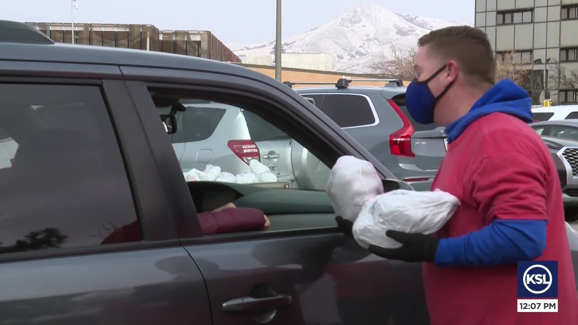 The meals were handed out by Ken Garff employees who bought and assembled each red bag on Monday with everything needed for a complete Thanksgiving meal.
