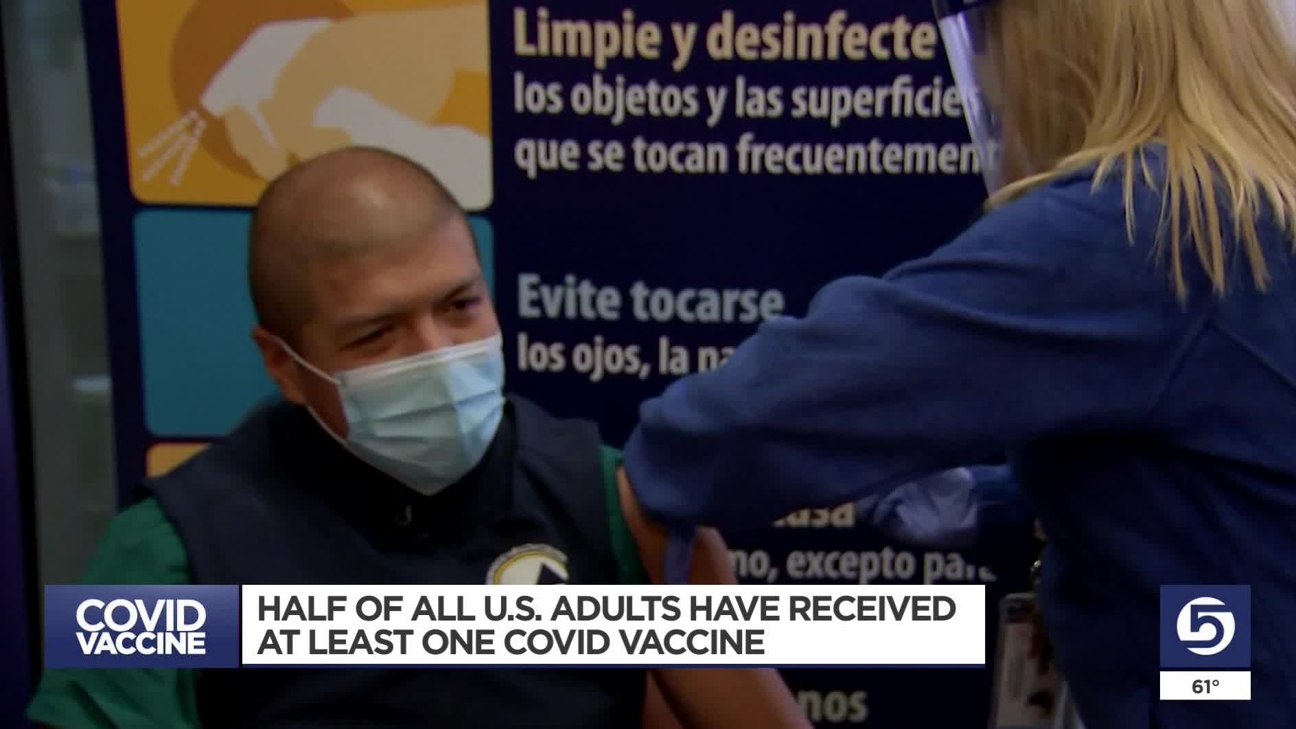 WASHINGTON (AP) — Half of all adults in the U.S. have received at least one COVID-19 shot, the government announced Sunday, marking another milestone in the nation's largest-ever vaccination campaign but leaving more work to do to convince skeptical Americans to roll up their sleeves.