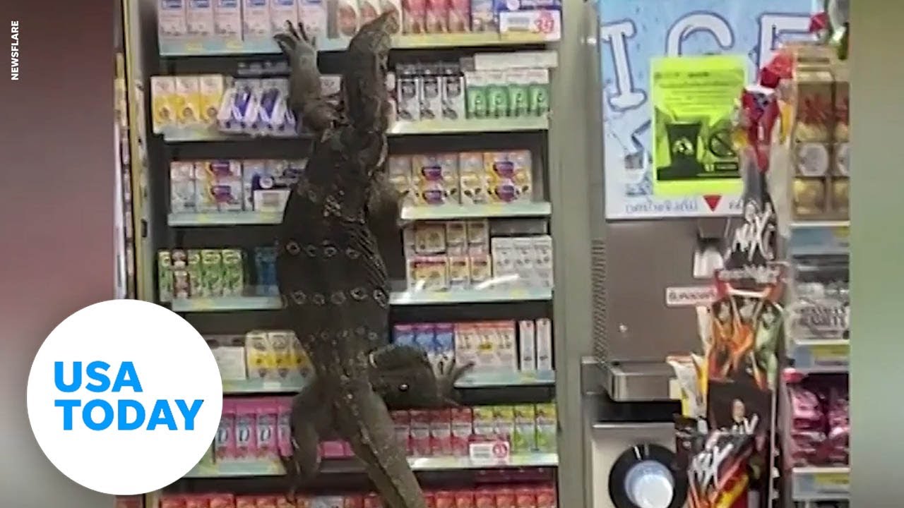 Workers and shoppers weren't sure what to do when this giant monitor lizard waltzed in like it owned the place and slowly made its way to the top of the shelves. I'm impressed that so many slips and near falls didn't seem to startle this reptile in the least. He just kept climbing until he reached his perch.