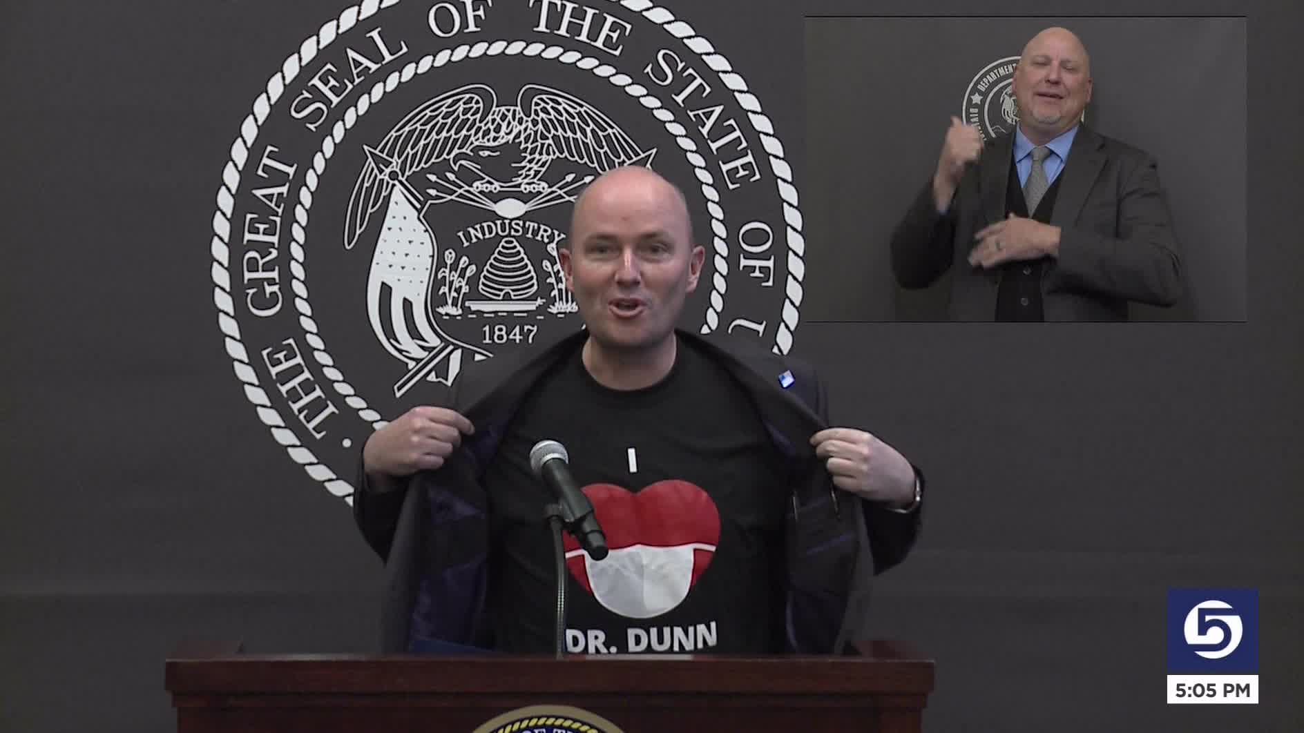 Cox wore an "I Love Dr. Dunn" T-shirt at Thursday's news conference to commemorate the occasion. He thanked the epidemiologist for her work over the past 14 months to protect Utahns from COVID-19.