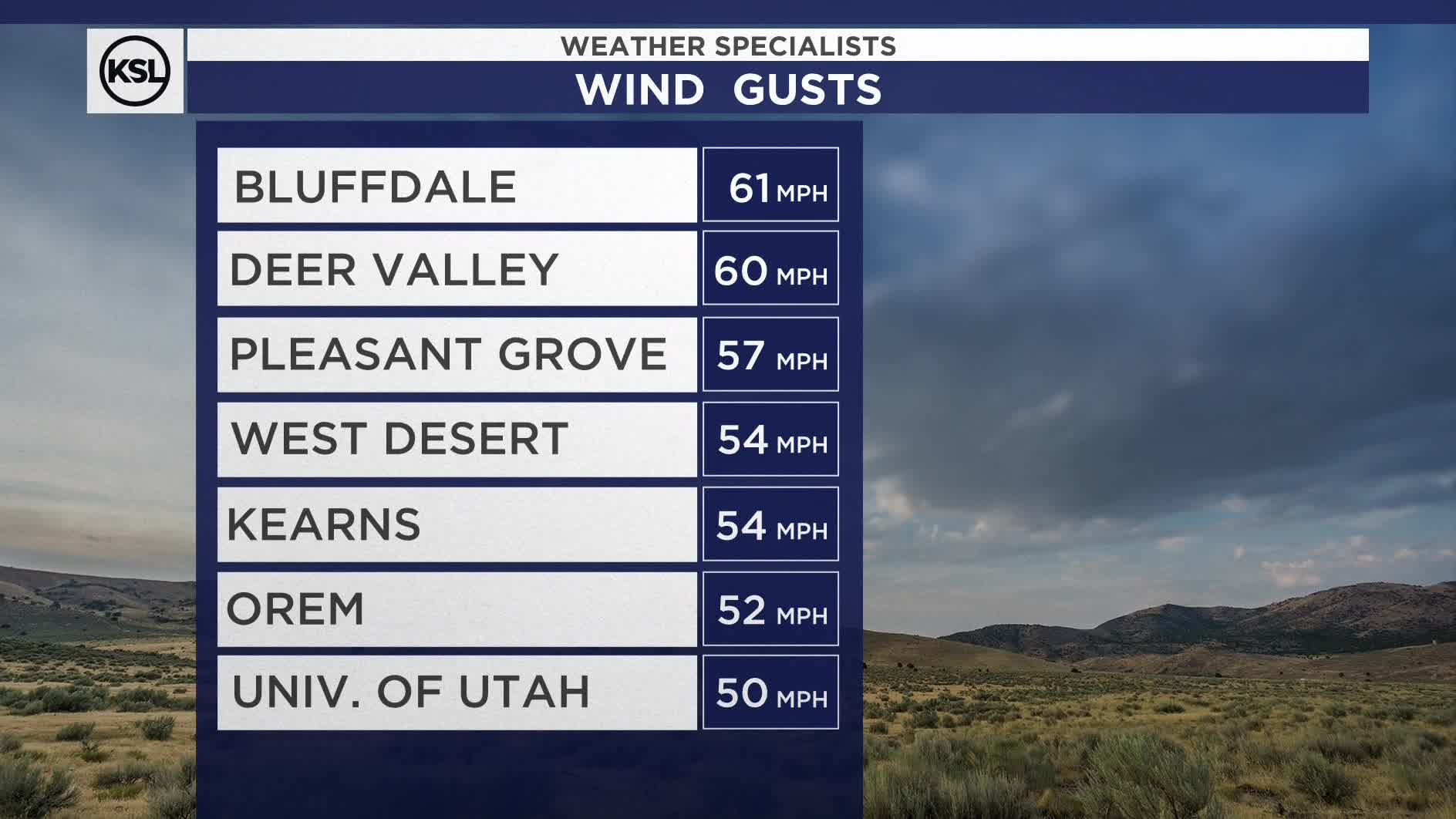 Wind gusts around 48 mph and dust reduced visibility down to 2 or 3 miles at the Salt Lake Airport and Ogden Airport on Friday evening. The weather service also reported strong gusts across the Traverse Mountains.