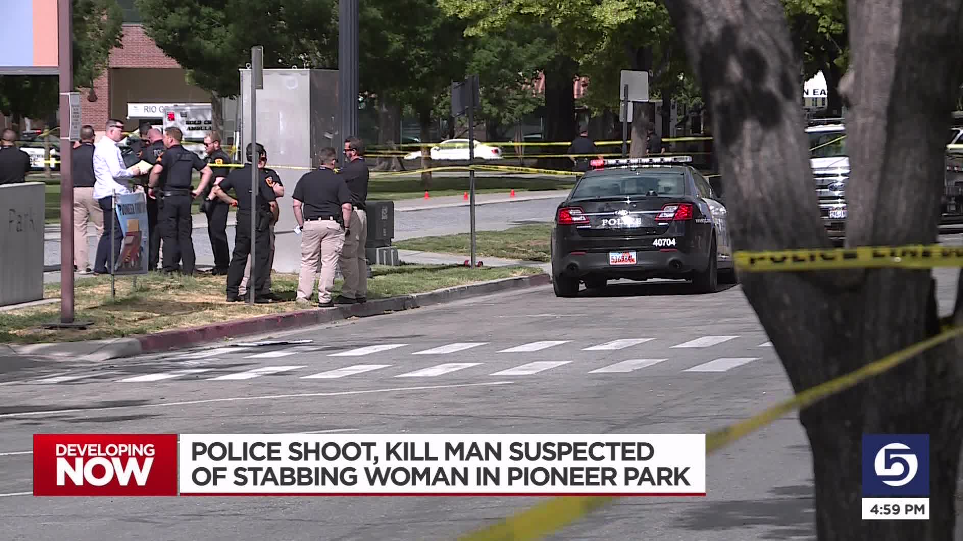 Multiple witnesses said the man stabbed the woman in the park, and then police shot him. Brown said officers assume it was the same man who stabbed the woman but hadn't yet confirmed that. Police said they didn't know what the relationship is between the woman who was stabbed and her attacker.