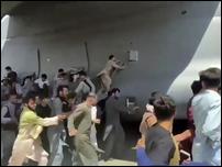Chaotic scenes at the airport included a group clinging to a U.S. military transport plane as it taxied on the single runway. One person appeared to fall from the plane during takeoff, according to television footage.