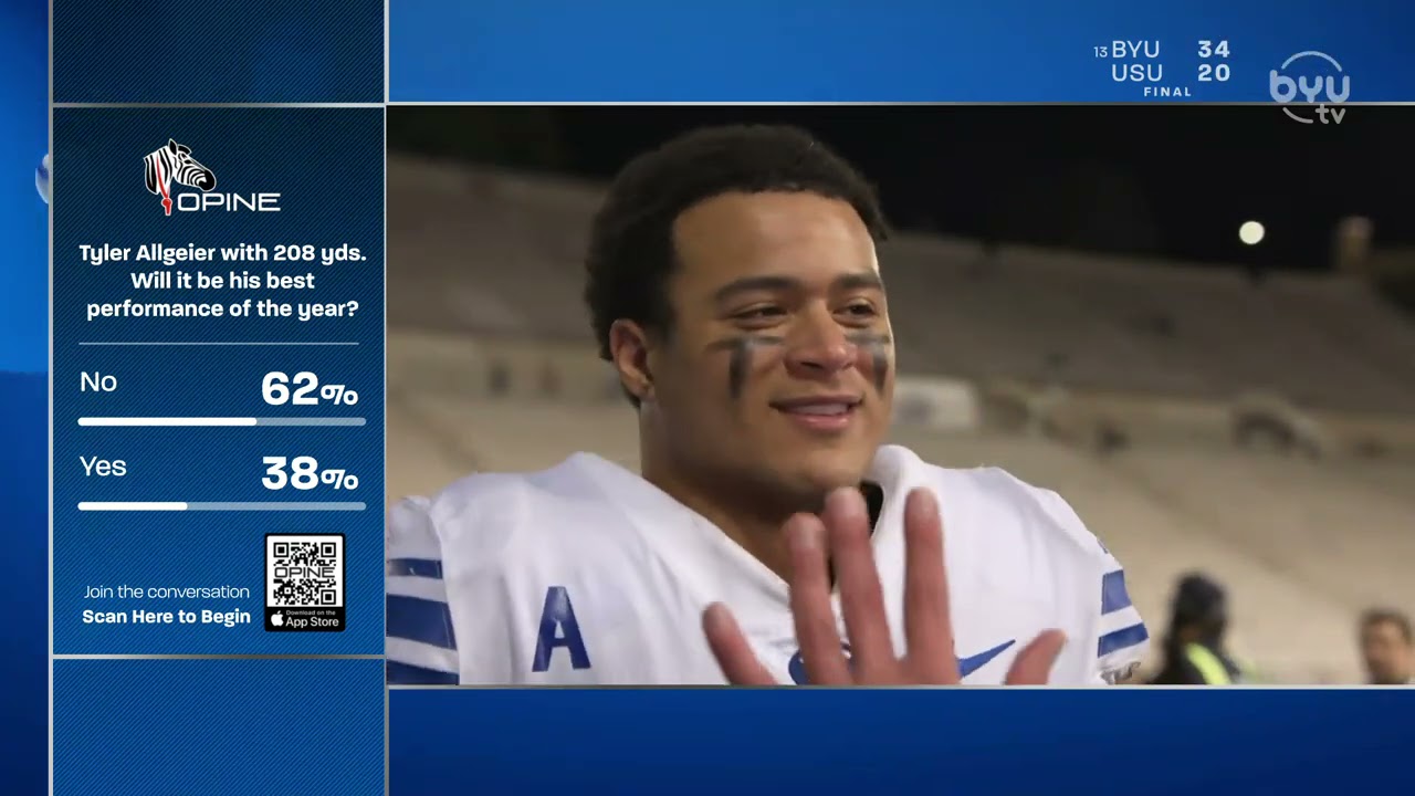 Allgeier ran for a career-high 218 yards and three touchdowns as No. 13 BYU jumped out to a 17-3 first-half lead and never let up en route to a 34-20 win over in-state rival Utah State to retain possession of the Old Wagon Wheel in front of an announced crowd of 25,240 at Maverik Stadium.