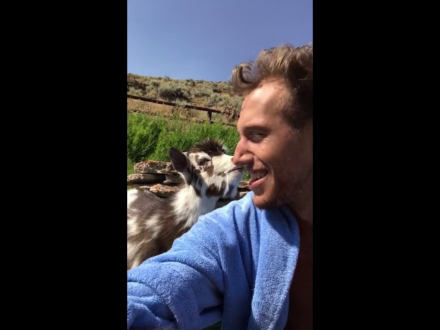 In this video, you'll see a man and a kid goat enjoying a day in the sun. The goat is chewing away, enjoying the fellow's company, when the man decides to pick a fight. The kid is not pleased.