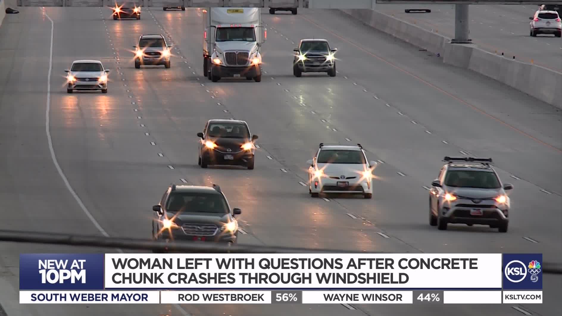 Sharon Cockayne said around 5 p.m. Monday, she was driving south along the west belt of Interstate 215, near 4100 South, when, without warning, the concrete chunk broke the glass in front of her.