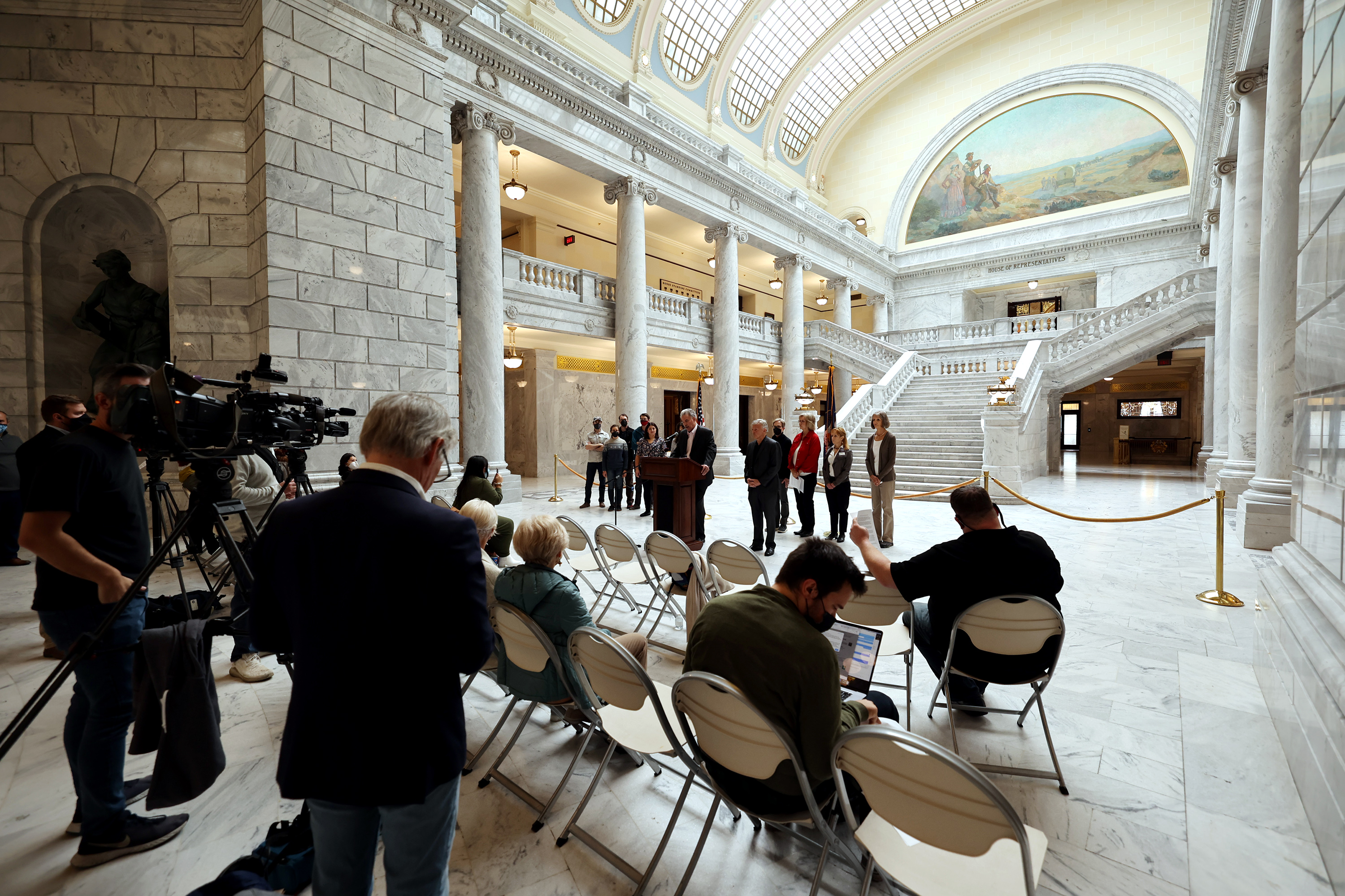 In the hours leading up to Wednesday's legislative hearing, prominent Utah businesses leaders and community members held a press conference at the Utah Capitol to release a letter urging lawmakers and Gov. Spencer Cox to adopt the independent commission's recommended maps and not the legislative committee's maps.
