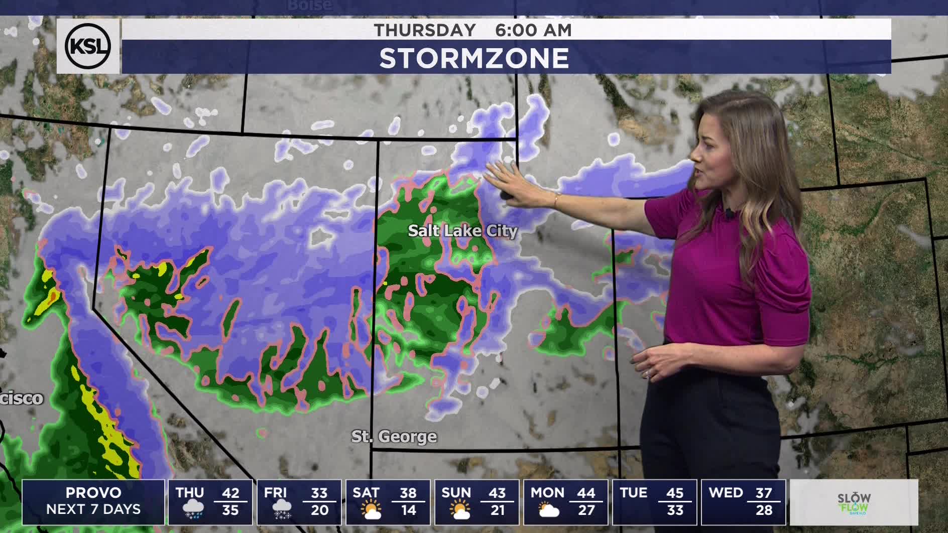 The storm, which follows a weaker storm system that passed through on Monday, started "taking shape" in the Pacific Northwest, according to KSL meteorologist Kevin Eubank. He added some parts of northern Utah may receive showers the rest of Wednesday but the brunt of the storm is expected to arrive Thursday as a low-pressure system will push the storm from the west toward most of Utah.