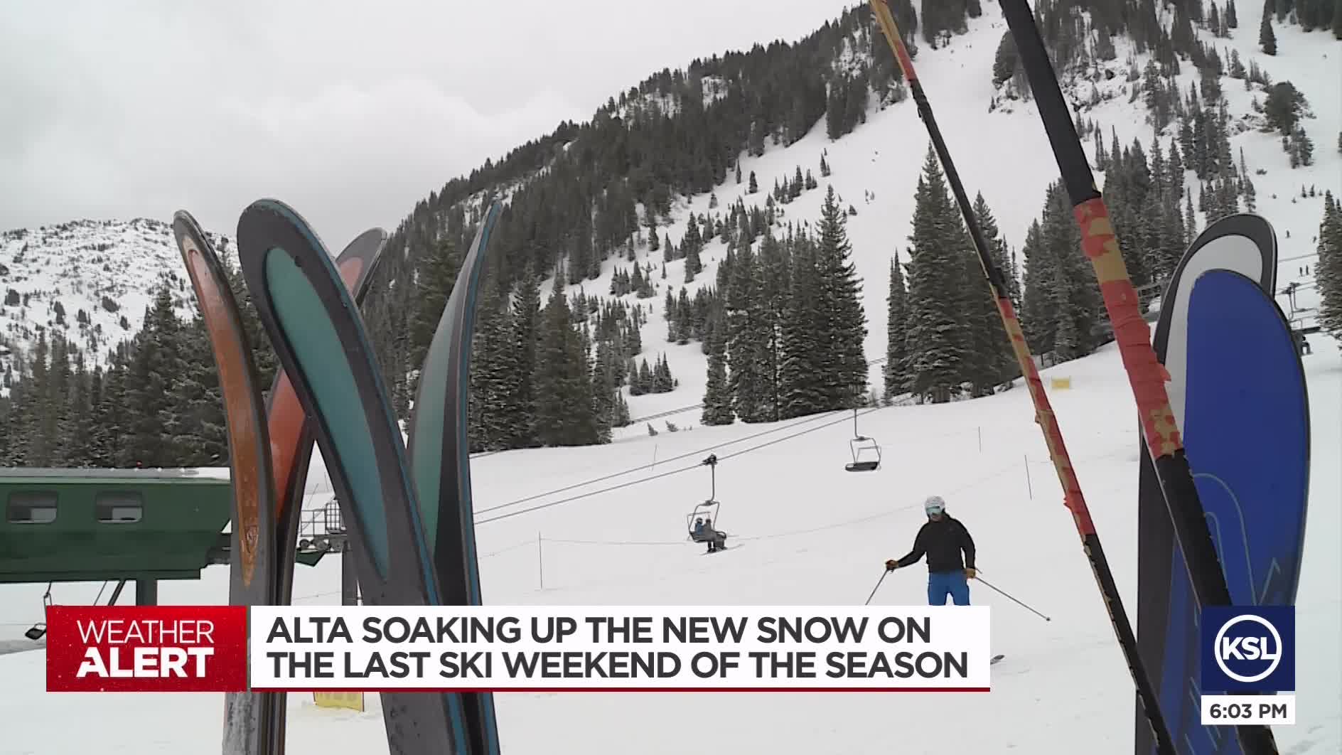 ALTA — The storm that brought steady rain to much of the valley dumped several inches of snow in the mountains Friday, just in time for the end of the ski season at resorts like Alta Ski Area.