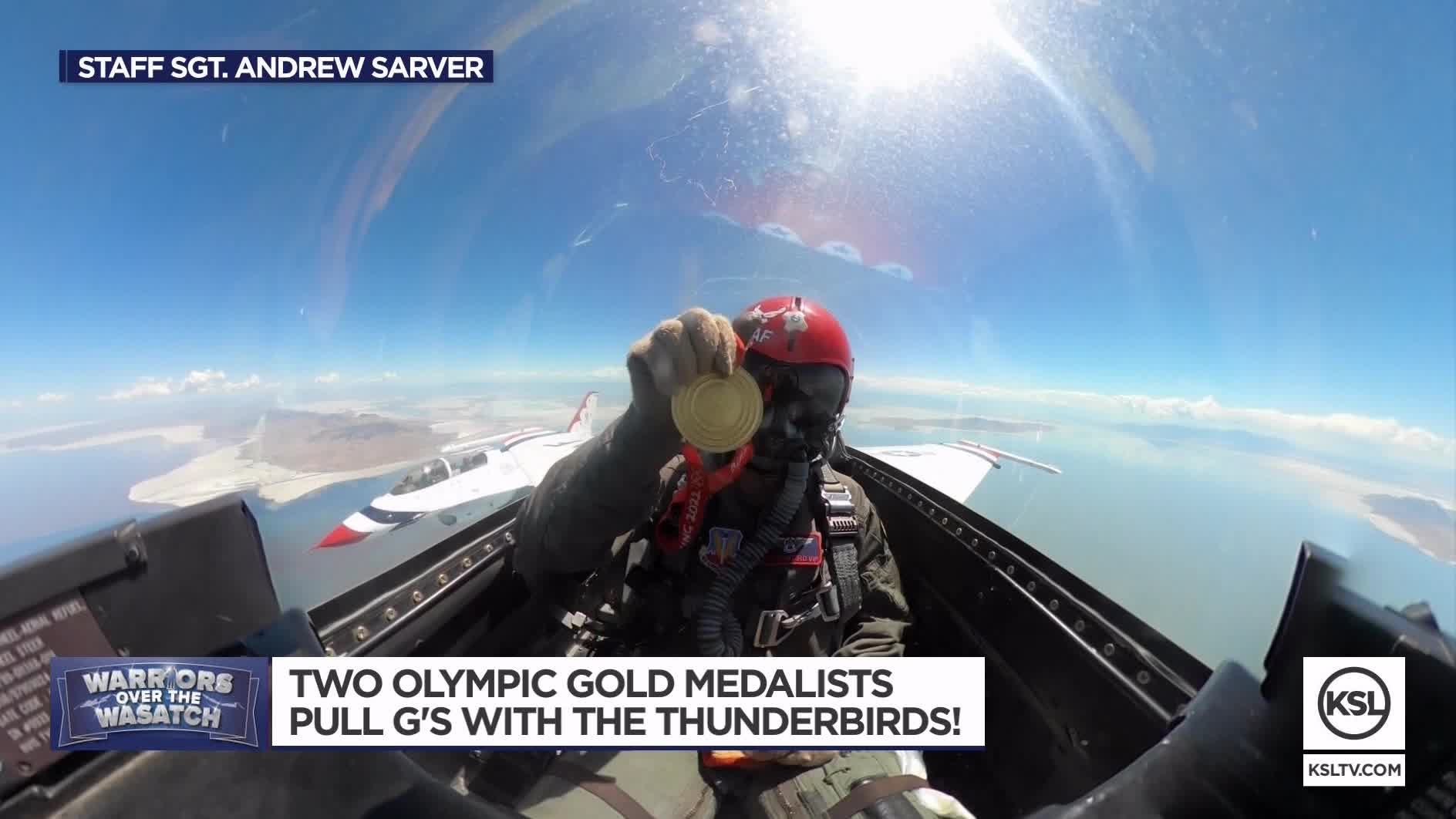 Flying with the Thunderbirds was a once-in-a-lifetime opportunity for these Olympians, but if there is one moment that stands out, it's when the pair were flying over the Bonneville Salt Flats towards the Great Salt Lake. With Caldwell on his wing, Schoenefeld pulled out his gold medal and showed it to the camera in the cockpit.