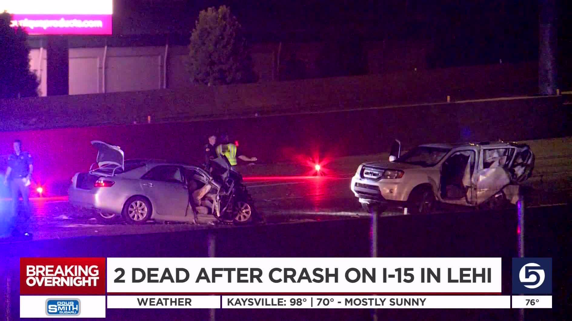 LEHI — Two people were killed in a crash on I-15 late Thursday after a car slammed into the back of an SUV stopped in traffic.