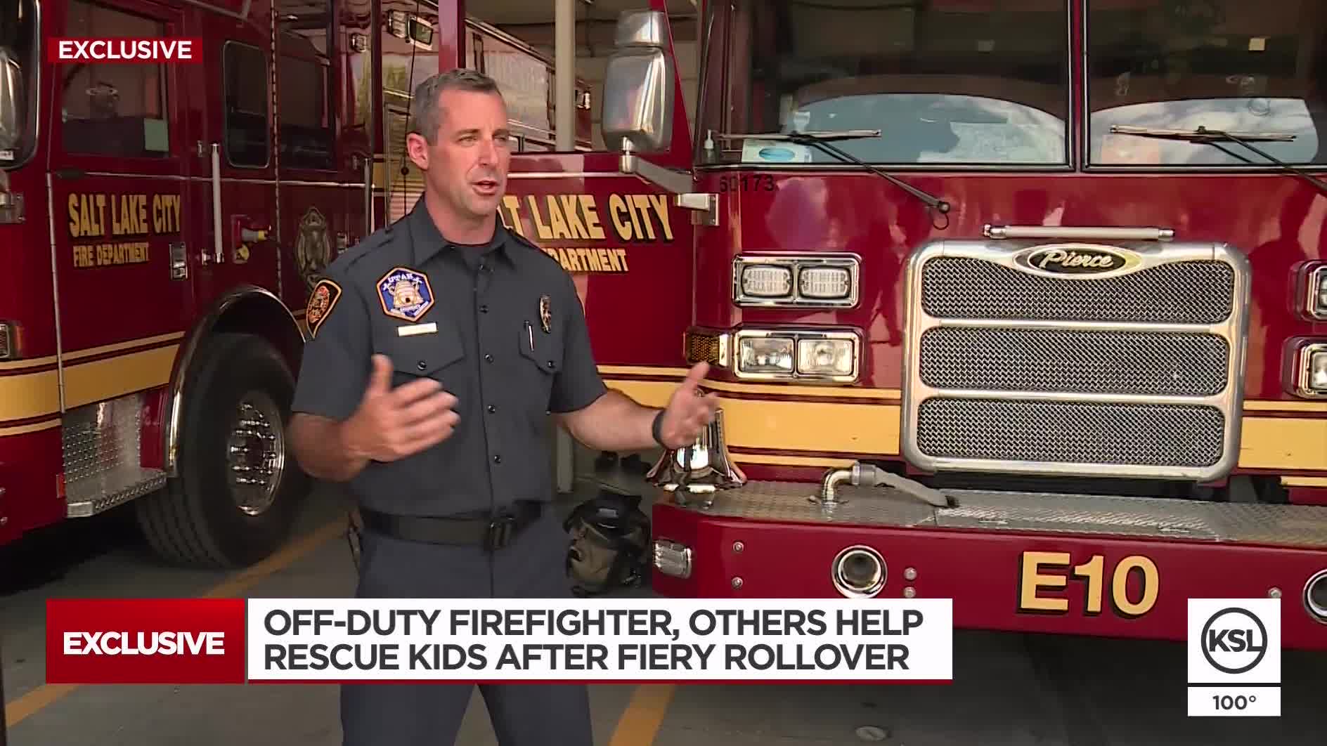 SALT LAKE CITY — An off-duty firefighter was with his family, wrapping up a monthslong recovery from injury, when he jumped in to help a driver and two children in a rollover crash and grass fire on a Salt Lake City ramp.