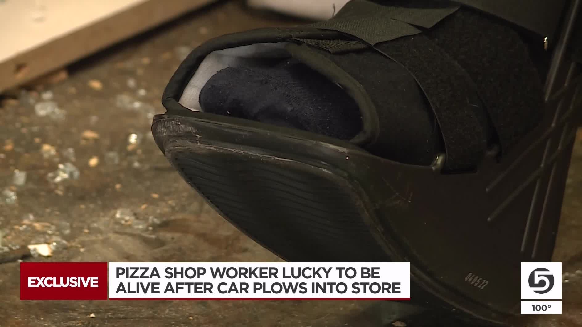 MIDVALE — A pizza shop employee hit by a car while inside the store is feeling very lucky to be alive.