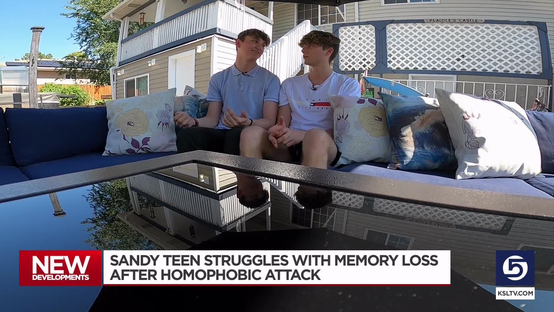 Stefanie Peacock said her 18-year-old son, Christian, and his boyfriend Jacob Metcalf, also 18, were attacked just after midnight Saturday. They were standing outside of the Peacocks' home in Sandy, a 97,000-person suburb southeast of Salt Lake City. A video recorded by Metcalf and posted on social media shows young men using homophobic slurs while Christian Peacock demands they leave.