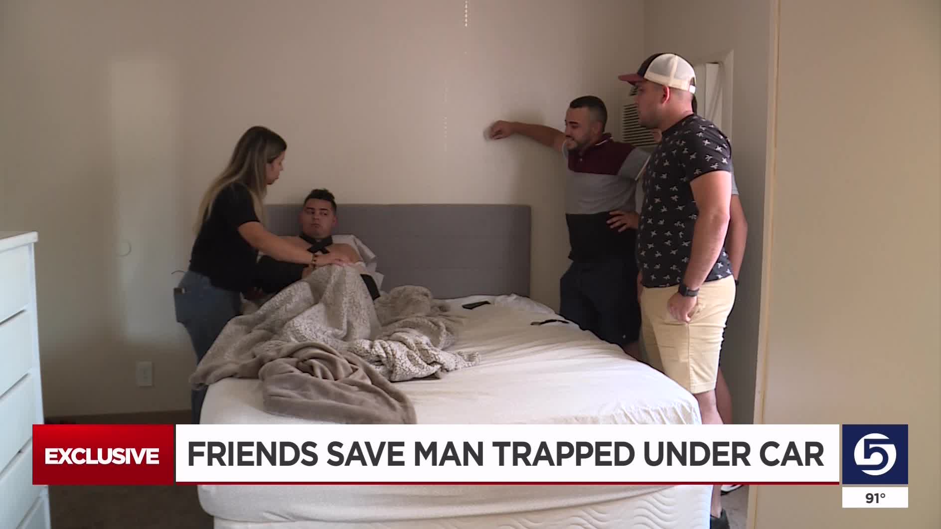 "The car was (on) him like right here," said one of the friends. "(We) don't know how we did it."