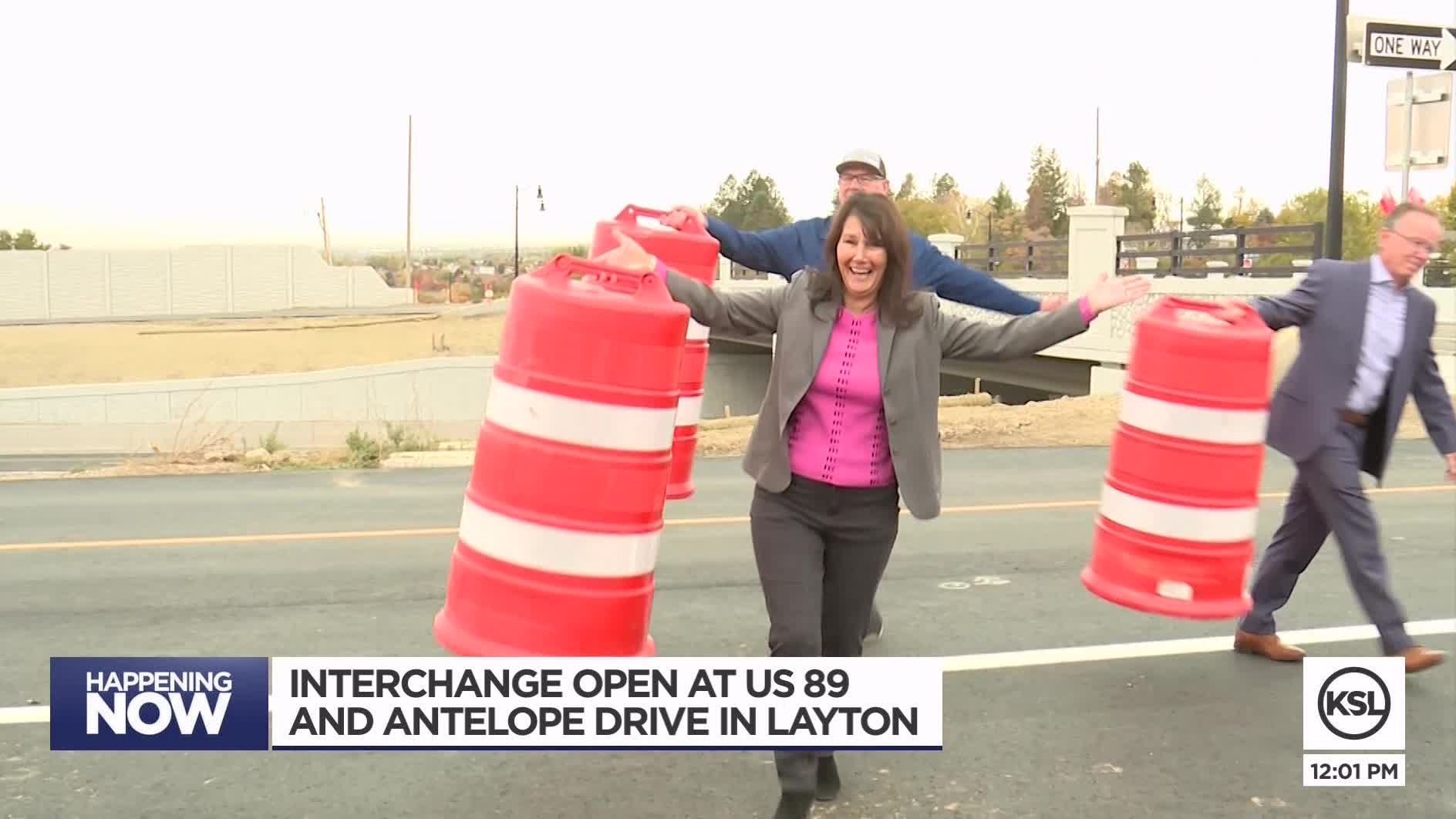 LAYTON — Joy Petro raised her hands in celebration Tuesday morning as she removed one of the last remaining cones blocking traffic onto a new U.S. Highway 89 interchange at Antelope Drive.