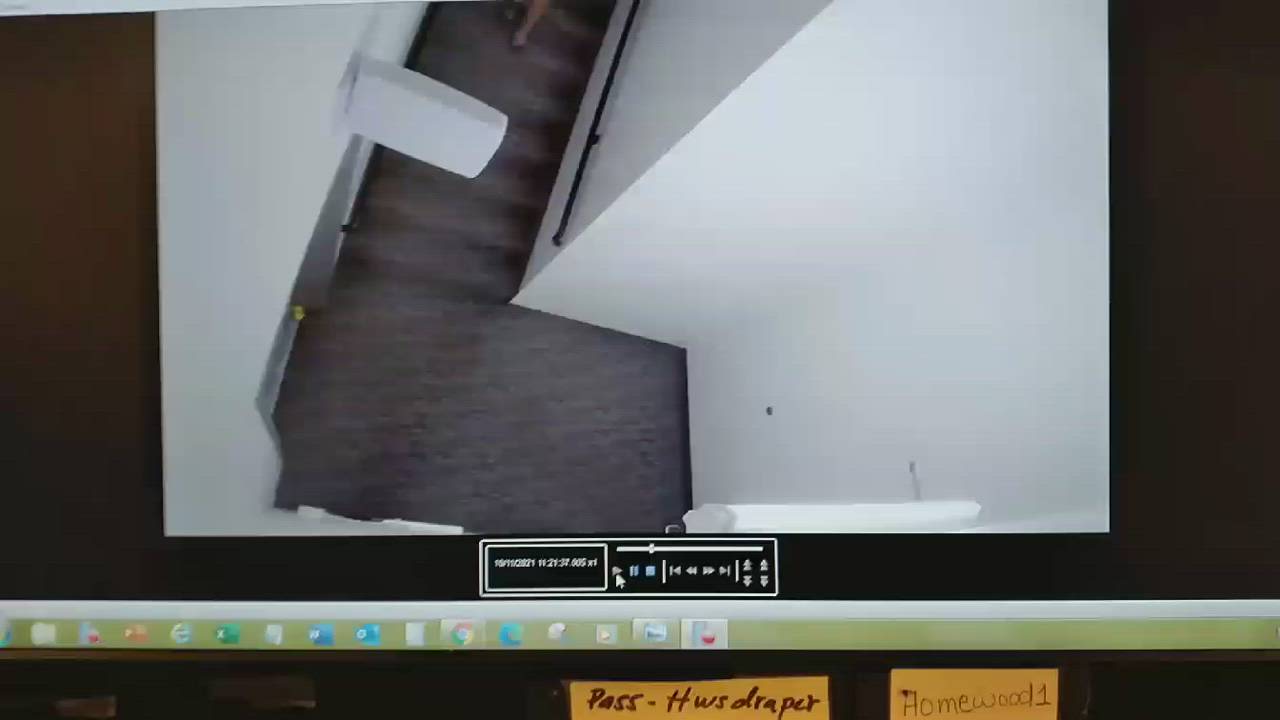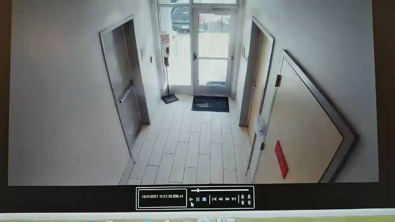 The videos show a man and woman walking down the stairwell of the hotel carrying a large object and loading it into a 1990s or early 2000s dark green Dodge Durango.