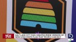 At the bottom lie horizontal rainbow stripes, with a similar variation of the middle dip. In the middle, Adamson placed a rainbow beehive on a black hexagon with a gold border. The eight-pointed star is purple.