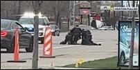 Once Sims is in handcuffs, a fair amount of blood can be seen on the road and the right side of his face is covered in blood. Police move him out of the road and have him sit on the curb of the sidewalk.