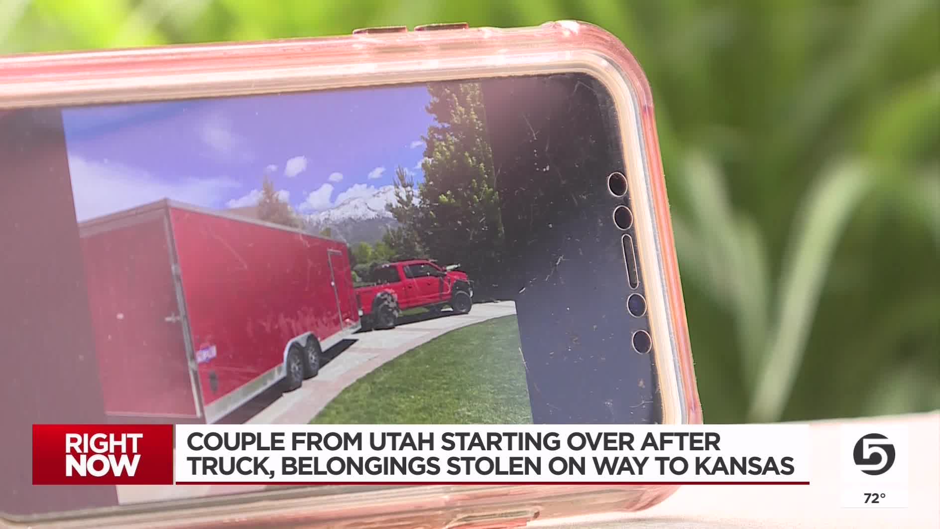 DENVER — A Utah couple on the way to a new life and new job in Kansas discovered their truck and trailer full of belongings had been stolen sometime Tuesday morning.