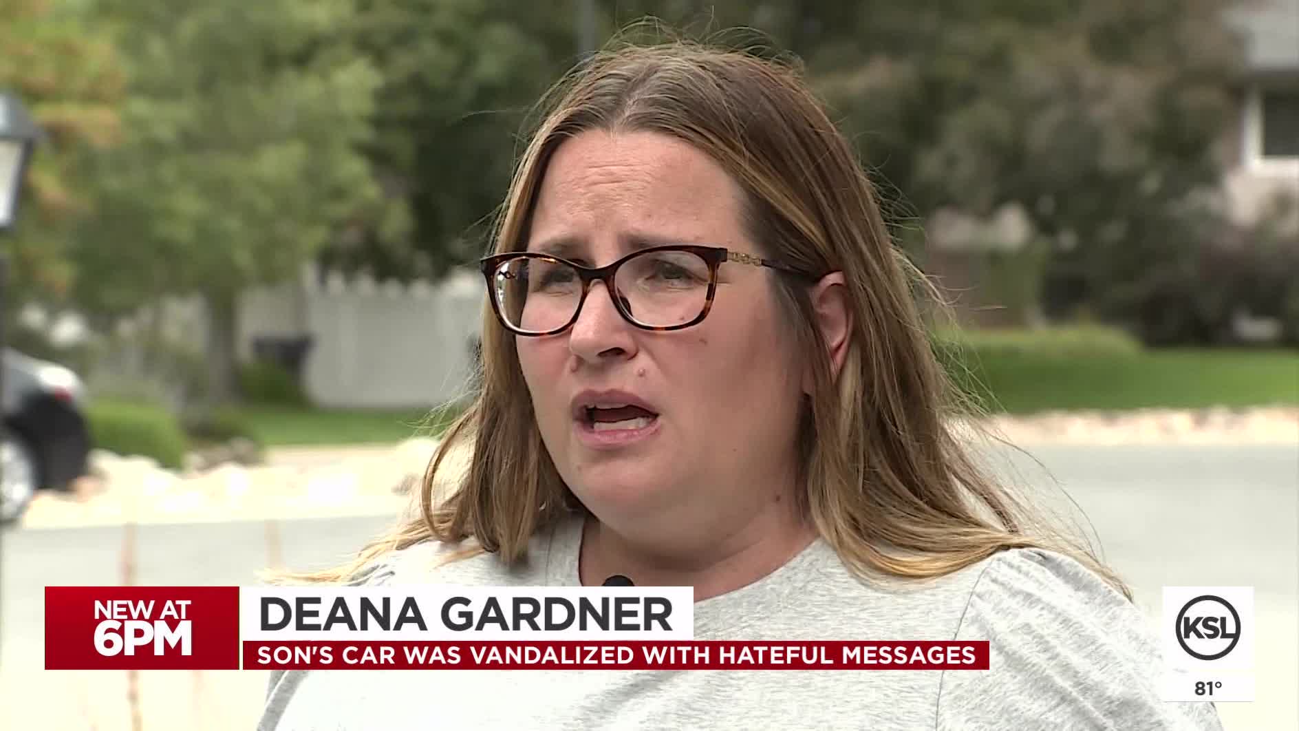 The Gardner's home and vehicle in Sandy's Willow Creek area were first targeted on Thursday night between 11:05 p.m. and 11:08 p.m. The family's doorbell security camera captured the moment one of the vandals threw an egg at their front door. A neighbor saw the commotion and chased the vandals away. But then Friday morning, the family woke to text messages about the damage.