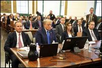 Trump wore his familiar blue suit, red tie and American flag pin. He appeared bored as Bender testified, and spoke frequently with his own lawyers.