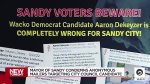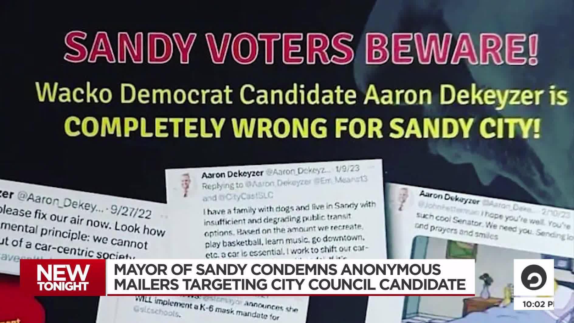 The mailers state "SANDY VOTERS BEWARE!" and that "Wacko Democrat Candidate Aaron Dekeyzer is COMPLETELY WRONG FOR SANDY CITY!" It also includes a link to a website that also claims to be "proudly paid for by a group of very concerned Sandy residents."