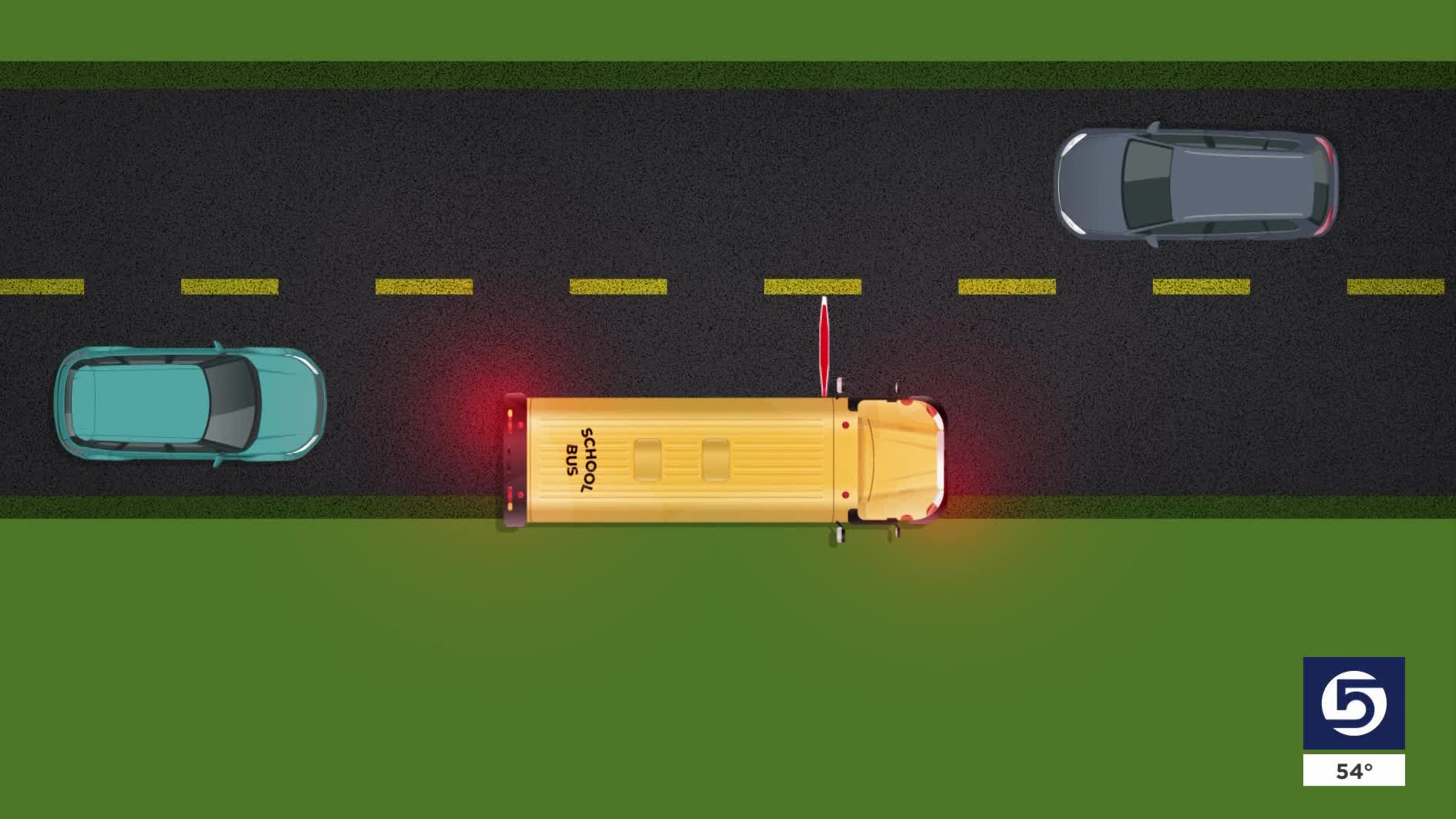 Perhaps the scenario that confuses drivers the most is when there's a five-lane roadway, with a "suicide lane" or a turn lane in the middle. If the bus makes a stop with flashing lights, the drivers in the two lanes behind it need to stop. Traffic on the other side of the turn lane, though, can proceed.