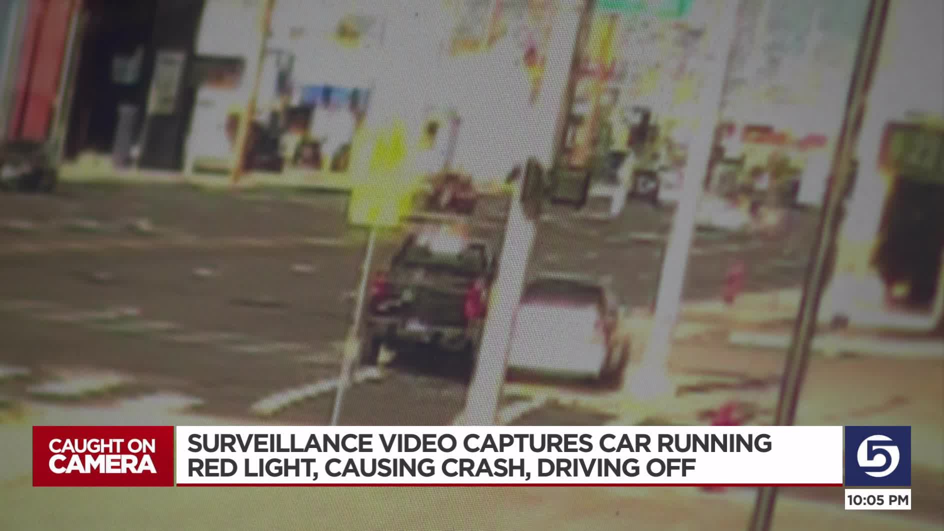 Surveillance camera footage from a neighboring business appeared to show the white car approaching the red light at a high rate of speed before driving into the intersection through the shoulder of the road.