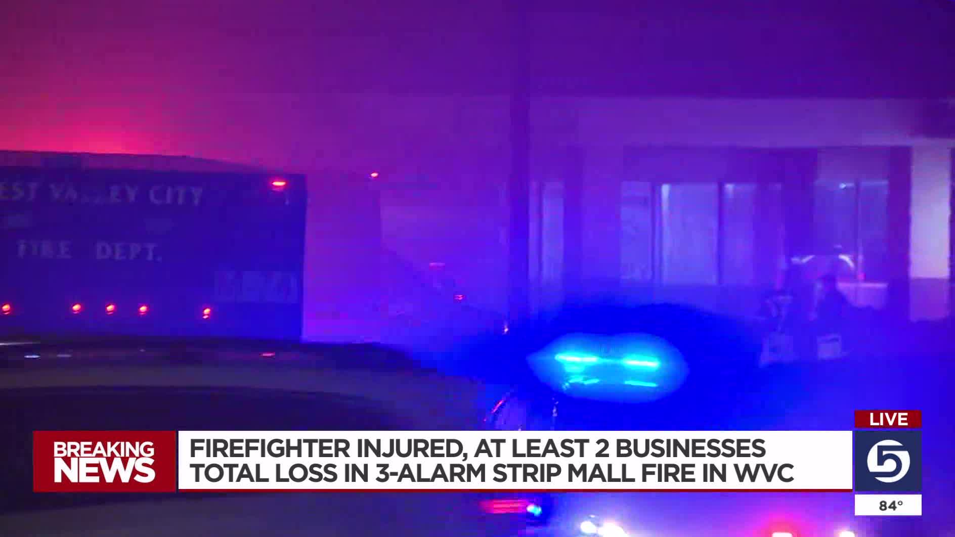 WEST VALLEY CITY — A firefighter was injured, and at least two businesses were declared total losses Thursday due to a three-alarm shopping center fire.