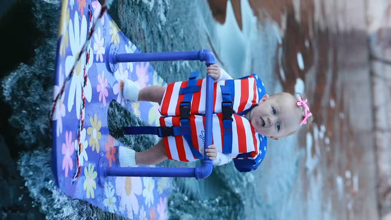 A bar for stability, flower paint and glued-on water shoes made the ski perfect for Daisy to hold onto and not sink below the water. At their home, the couple put Daisy on the ski to see how she'd like it. She immediately began smiling and laughing, indicating to her parents she may be ready to test out the waters.