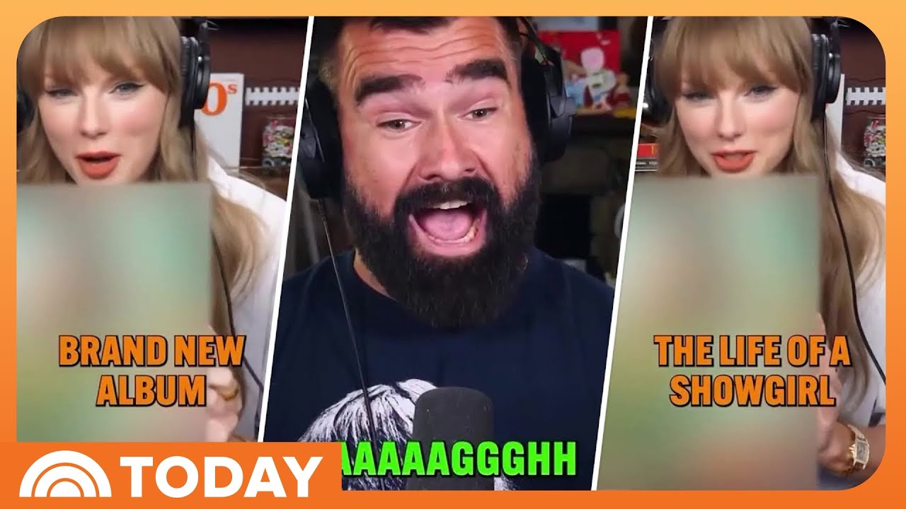 A teaser for a new episode of Travis and Jason Kelce's podcast, "New Heights," revealed Swift as the brothers' guest this week, and she isn't coming to the party empty-handed.