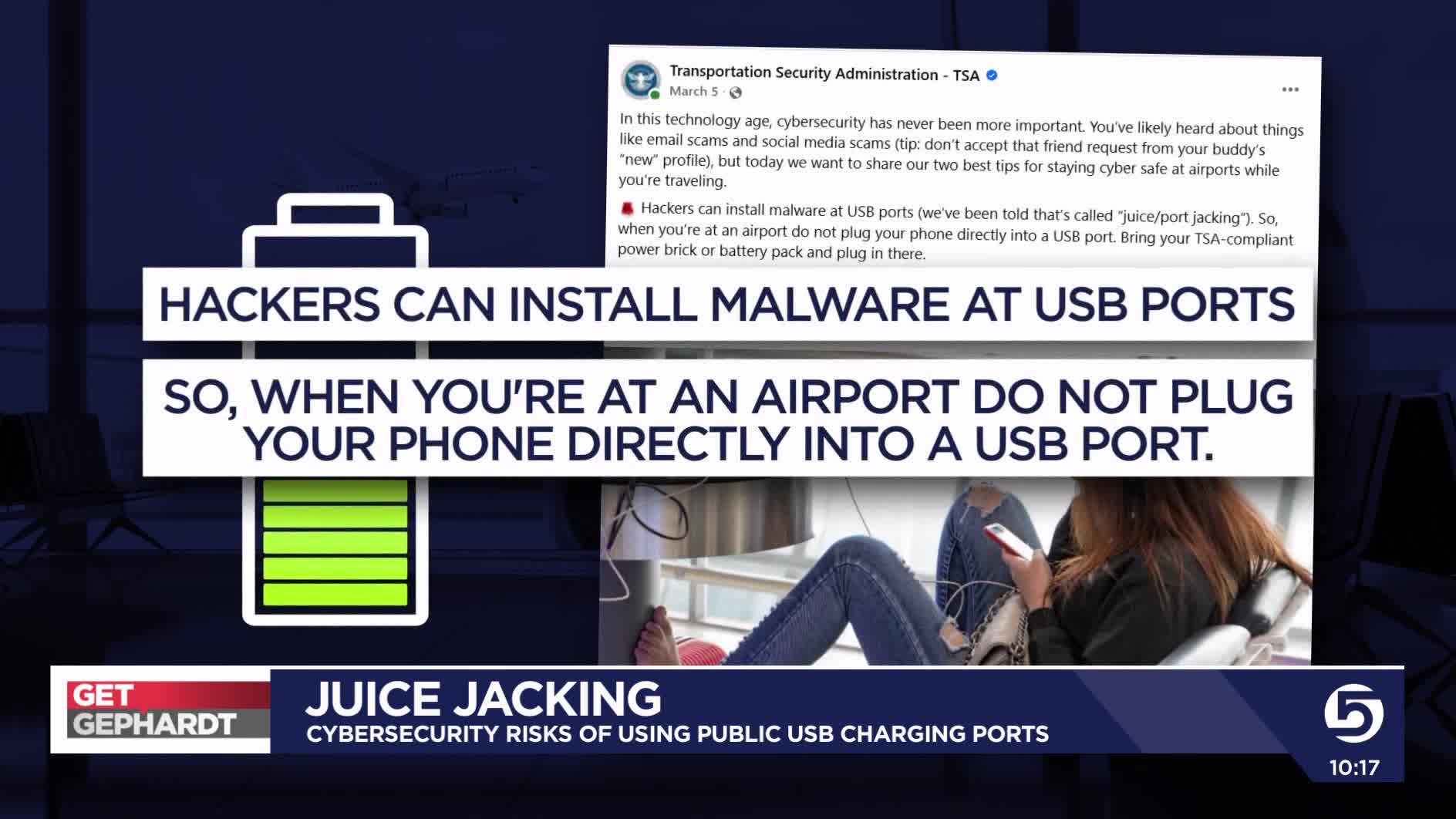A recent post on the Transportation Security Administration's Facebook page warning that "Hackers can install malware at USB ports," and that "when you're at an airport do not plug your phone directly into a USB port." It's called "juice jacking."