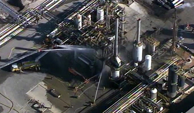 Surrounding refineries were putting off a lot of smoke, but that was due to power bumps caused by the initial explosion. None of them was in any danger, according to Bassett. Power has been restored.