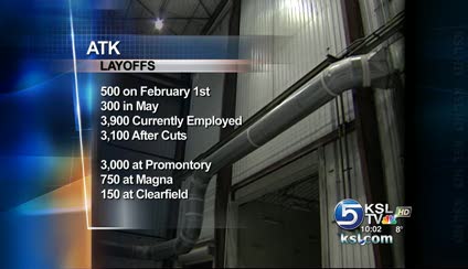 ATK spokesman George Torres says the layoffs will hit the company's Clearfield plant, which refurbishes spent booster rockets; its Promontory test facility and in Magna where much of the Minute Man III missile work is based.