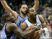 Al Jefferson scored 21 points for the Wolves, who took a 47-46 halftime lead. Boozer scored a quick inside basket and the Jazz opened the third quarter on a 9-1 run. Utah added a 10-0 burst later in the period to build a big enough cushion to survive the Minnesota rally.
