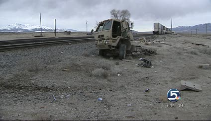 FAUST CROSSING -- A train hit a military vehicle Saturday afternoon at Faust Crossing, just south of Tooele.