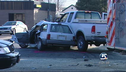 Police say a pickup truck ran a stop sign at the intersection of 3500 South and Main Street, and slammed into a Ford Escort. Another SUV ricocheted off those cars, sending it onto the sidewalk and into a business.