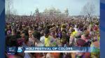 Music and dancing are part of the annual celebration; and each hour, participants throw of brightly colored corn starch into the air.