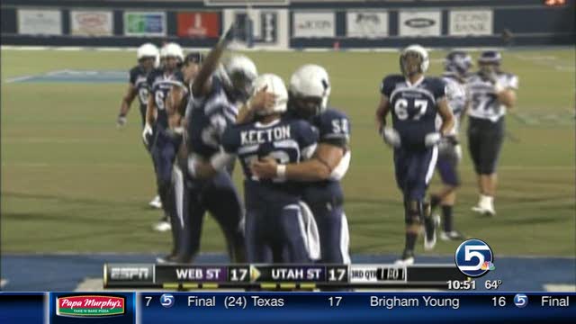 The Aggies (1-1) scored 23 unanswered points in the third quarter to open things up after a 17-17 halftime tie. Weber State (0-2) had minus-3 yards rushing in the third quarter, gaining 15 yards total offense to 237 in the quarter for USU.
